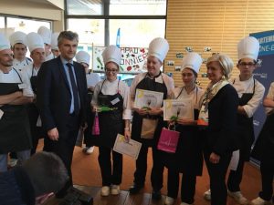 Chaque chef était présent avec des résidents de sa structure ; à leurs côtés également les élèves du lycée hôtelier du sacré cœur de Paray où se déroulait la finale et le chef étoilé Cédric Burtin parrain de ce concours; un très bel exemple de rencontres intergenerationnelles et de leur utilité. J’ai félicité et récompensé les quatre finalistes et leurs brigades respectives et tout particulièrement Isabelle Gibert, chef cuisinier de la maison de famille de bourgogne à Étang-sur-Arroux qui défendra les couleurs du Département de Saône-et-Loire en juin prochain lors de la finale nationale. Un grand bravo également à Charlotte Thomas et Jeanne Ibanez, les deux apprenties du lycée professionnel parodien qui l’ont accompagnée dans cette épreuve, mais aussi à tous les élèves qui ont pris en charge les personnes âgées présentes dans le cadre de leur apprentissage, et les équipes encadrantes.