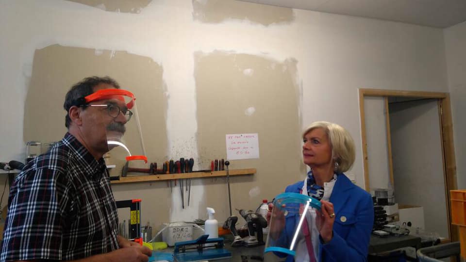 A Gueugnon la mobilisation a été importante, tant du côté de la municipalité que du milieu associatif à l’image de Syntaxe erreur 2.0 qui a réalisé des conceptions inédites. Deux ateliers ont pris forme pendant le confinement, nécessitant même l’embauche de personnels : un pour fabriquer des visières et l’autre pour re conditionner des ordinateurs ; l’objectif étant de pouvoir approvisionner le plus grand nombre avec ces matériels. 470 visières ont été fabriquées et livrées gracieusement à des commerces, associations, maisons d’anciens…